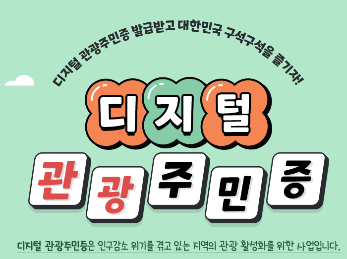디지털 관광주민증은 인구 감소 위기 지역의 관광 활성화를 위해 발급되는 명예주민증입니다. 국내로 휴가 등의 계획이 있으신 분들께서는 디지털 관광주민증으로 다양한 할인 혜택 받으셔서 즐거운 휴가 보내시길 바랍니다.