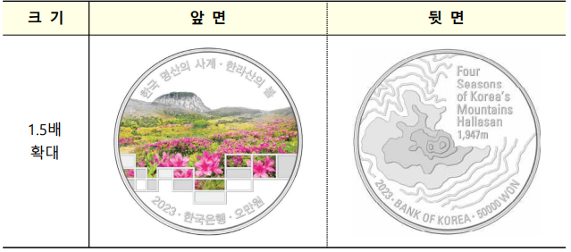 기념주화 4종은 주화의 앞면은 사계절의 특징을 잘 나타내는 자연경관을, 뒷면은 각 산의 등고선과 높이를 표시했으며, 특히 앞면의 경우 마치 창문을 통해 산을 바라보는 듯한 느낌이 들도록 사가 프레임을 적용한 것이 특징입니다.
