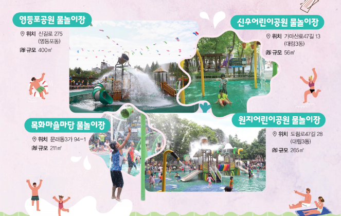 영등포 공원 4곳에서 물놀이장이 개장을 했습니다. 이 물놀이장은 수심이 깊지 않아서 어린 친구들이 놀기에도 좋습니다. 그만큼 물놀이장을 즐기러 오는 사람들도 많습니다. 대부분 그늘이 적어서 그늘막을 갖고 오시는 분들도 있습니다.